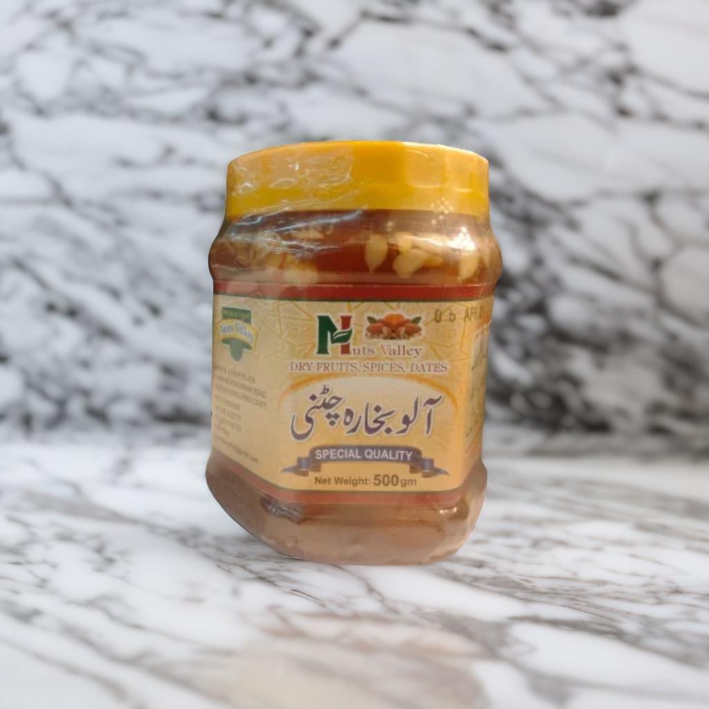 Alu Bukhara Chatni is a sweet and sour chutney made from dried plums, also known as aloo Bukhara. It is a popular chutney in North Indian cuisine and is often served as a side dish with parathas, pooris, and other savory dishes.